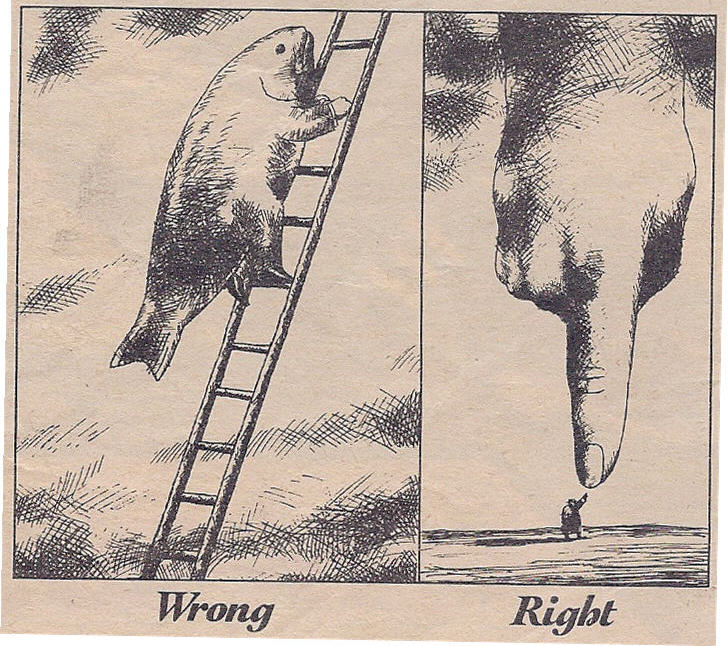 This cartoon is related to the first for me, although upon seeing it again I suppose it could also be taken as a conservative Christian statement about the sentiments which espouse the wrongness of the theory of evolution. I took it as a way of saying that – for me – dressing up myself, or the bumper of my car, in the sign of a fish, and wearing that costume to climb up to heaven using the ladder of a religious organization doesn’t work. What works is simply staying in touch with that thing which is simultaneously larger than myself, and is me; God, Nature, The Tao, The Universe, Creation, Humanity, and so forth.